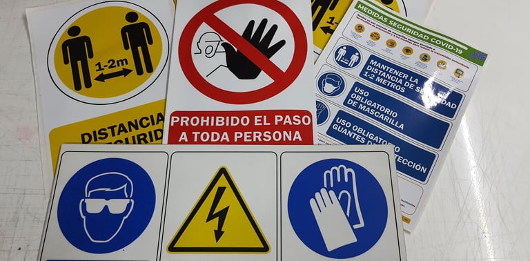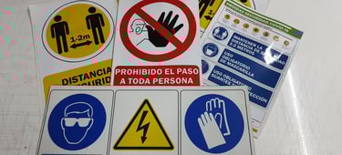 Fabricamos las señales normalizadas con colores, símbolos y textos que advierten sobre peligros, indican obligaciones o informan sobre medidas de emergencia.