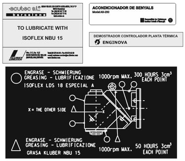 Ideal para placas de maquinaria, etiquetas técnicas y señalización exterior.